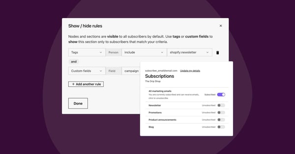 Save time by dynamically showing and hiding content to subscribers based on tags and custom fields.