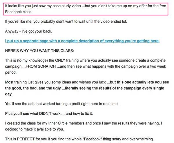 Während sie auf der Website von Frank Kern stöberte, schaute sie sich ein Video an. Kurz nachdem sie das Video angesehen hatte, erhielt sie die folgende E-Mail: