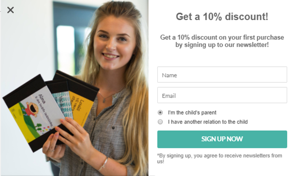 Así es como My Best Book recabó direcciones de email ofreciéndoles a los visitantes un 10% de descuento en su primera compra: