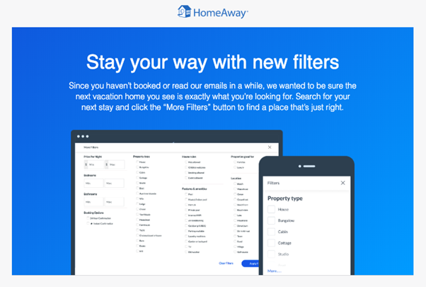 HomeAway nos envió este email de reconexión porque no habíamos reservado nada ni leído sus emails en un buen tiempo.