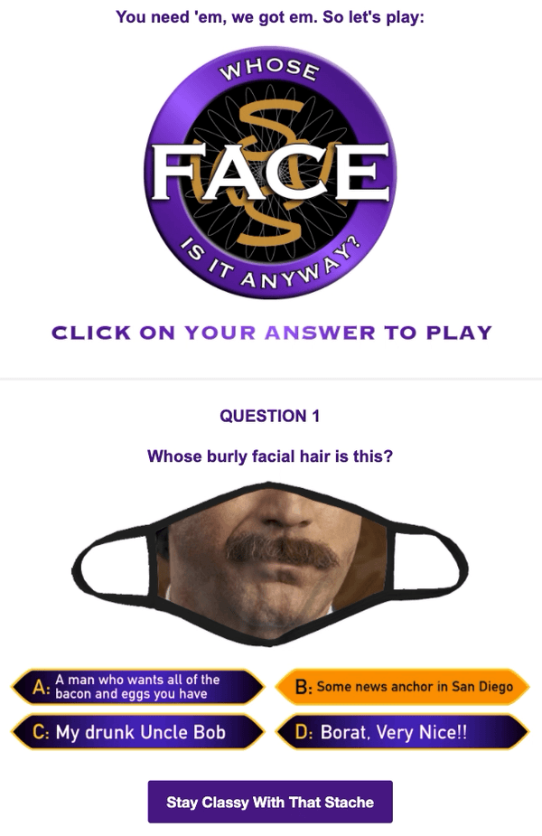 Anziché mostrare semplicemente le diverse mascherine, trasformano l’attività in un gioco, e, ovviamente, a prescindere dalla risposta esilarante scelta, ti reindirizzano alle pagine dei prodotti.