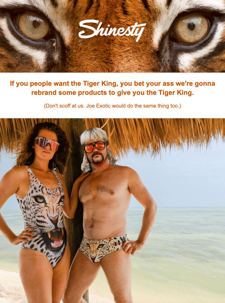 Quando si parla di umorismo, Shinesty va oltre. Dai un’occhiata a questa email che hanno inviato qualche mese fa con l’oggetto “you want the tiger king…”, in italiano “ecco il tiger king che stai cercando…”: