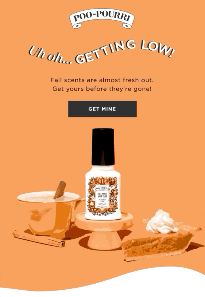 In it, Poo~Pourri informs you that its fall products are about to sell out, so you better hurry to get yours before itâs too late. The CTA button âGet Mineâ complements the subject line and email copy by using power words that speak to your greed.