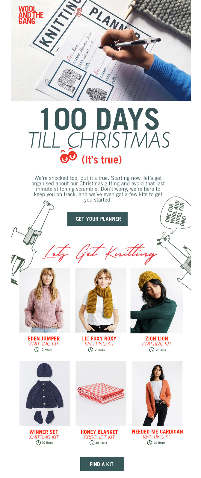 Wool and the Gang cleverly gives you a gentle nudge with this reminder: You should start thinking about gift shopping because you have 100 days until Christmas.