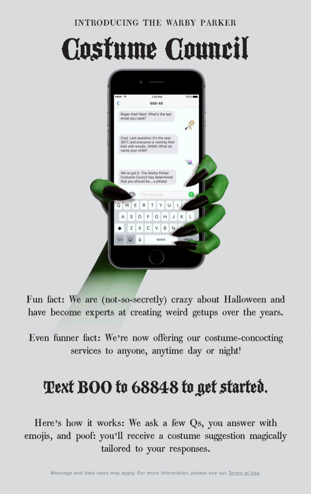 In it, Warby Parker introduces its new âserviceâ where they suggest a tailored Halloween costume idea, based on the emojis you text them.