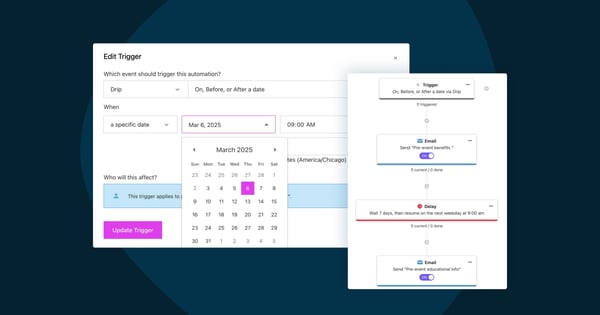 Part one of date-based Workflows is here. Save time by triggering automated emails on, before, or after a specific date leading up to a one-time event, and create looping workflows based on a date. See how it works with our new Pre-Event Series Workflow Template.