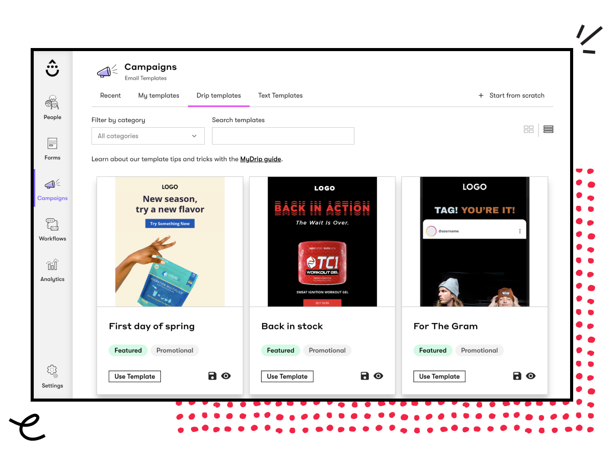 With Drip, all you need to do is pick an email or popup template based on your goal, customize it as much as you’d like (whether you spend two minutes or ten, it’s guaranteed to look damn good 😉), and then set it into motion in minutes.