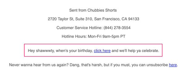 A Chubbies adiciona essa notinha no final de cada e-mail enviado. Ela lhe convida a compartilhar a data de seu aniversário com o seu estilo humorístico. E ela deixa óbvio que você pode ganhar algo com isso.