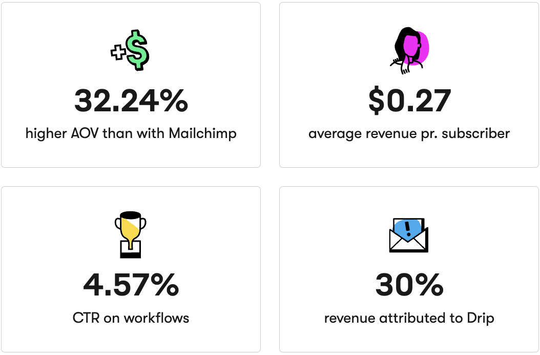 Their average order value for newsletters has increased from 343 DKK with Mailchimp to 454 DKK in Drip—an impressive rise of 32.24%.